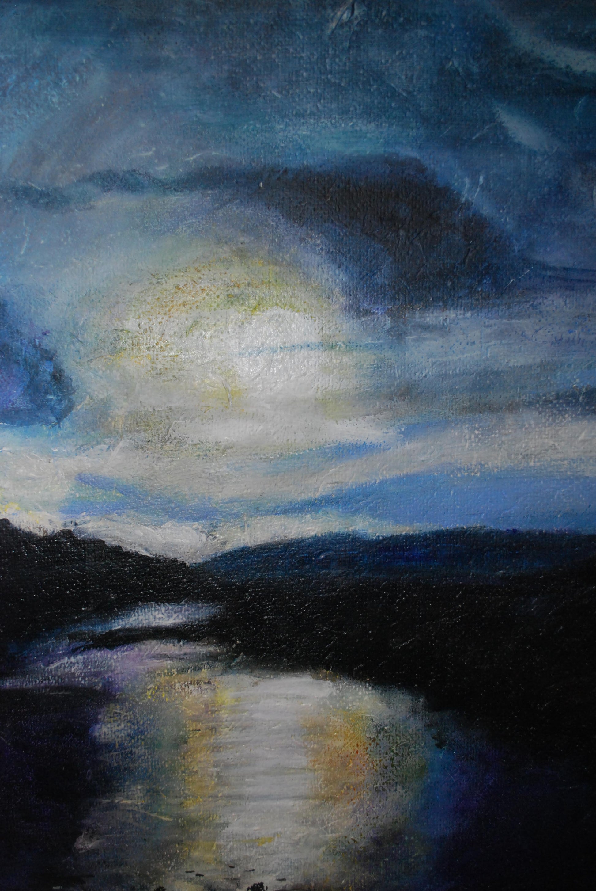An atmospheric nocturne capturing the quiet reflection of moonlight over still water. Deep blues and silvers dissolve into soft purples and shadowed hills, evoking the calm and mystery of a Tasmanian night. The layered texture and tonal shifts create a sense of depth and stillness, a study in light, reflection, and silence.