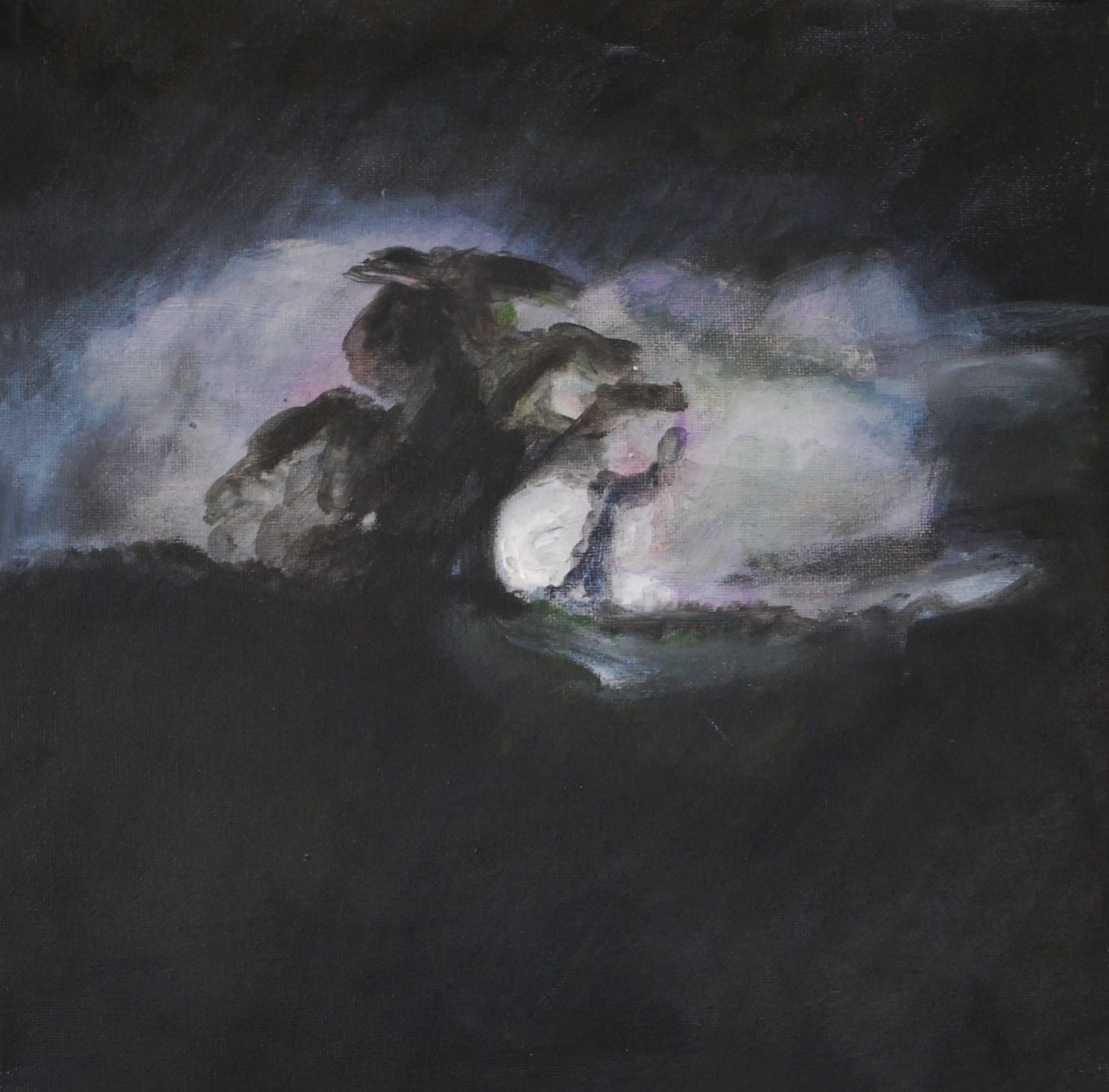 A moody nocturnal study where shadow and light meet. Night Tree captures the silhouette of a tree against a misted glow, evoking the stillness and quiet mystery of the Tasmanian night. Subtle tones of violet, grey, and soft white emerge through the darkness, creating depth and atmosphere. A contemplative piece that invites the viewer into a landscape both dreamlike and grounded.